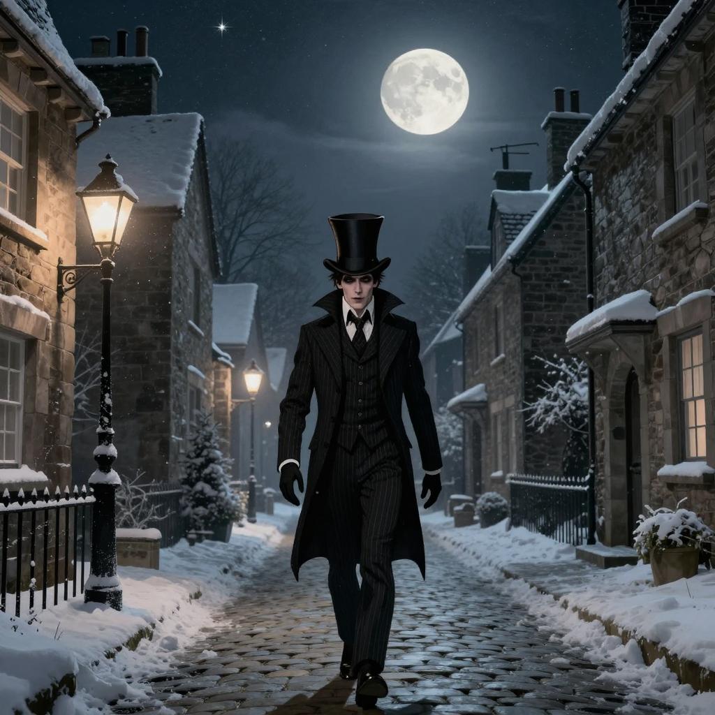 Illustration of a gothic man wearing a tall black top hat and pinstripe suit, walking down a cobblestone street lined with snow-covered stone houses and vintage street lamps. A full moon illuminates the snowy night sky filled with stars, creating a dark yet magical atmosphere.
