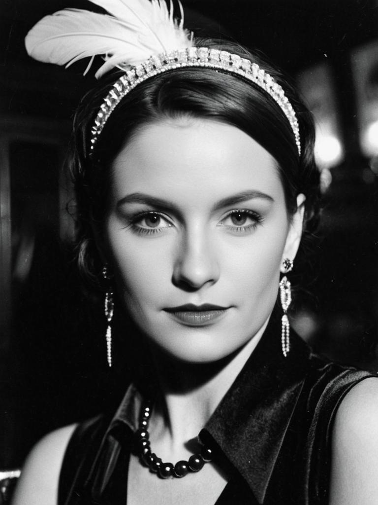 Close-up black and white portrait of a woman wearing a 1920s style speakeasy costume. She has a feathered headband, sparkling earrings, and a beaded necklace, embodying the classic flapper look. The image highlights her detailed facial features and vintage elegance.