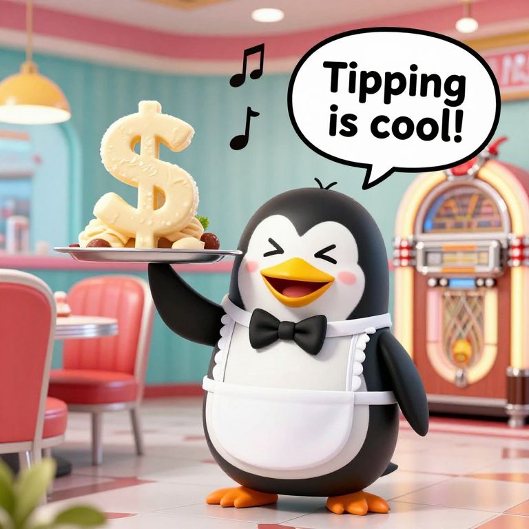 A cartoonish waiter penguin wearing a bow tie and holding a silver tray with a giant dollar sign made of ice cream on top, The penguin has a cheeky smile and a speech bubble that says, 'Tipping is cool!' The background is a colorful, whimsical diner with playful, exaggerated features like oversized chairs and a jukebox playing music notes that float in the air