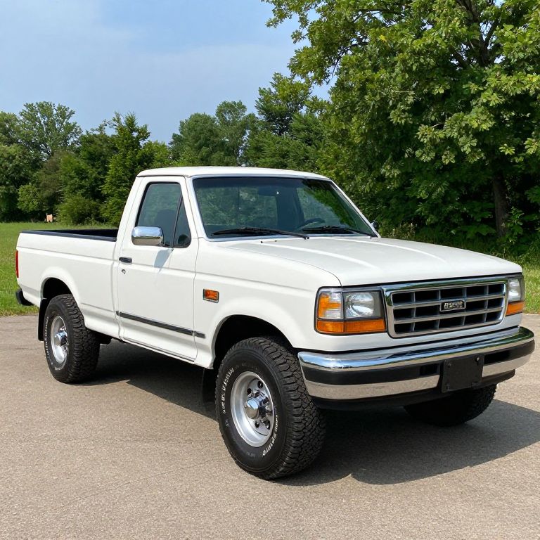 Photograph of a white, lifted Ford pickup truck with large black tires and shiny chrome rims, parked on a gravel surface. The truck has an orange and white rectangular grille, and its windows are slightly tinted. The background features lush green trees and a clear blue sky. The truck's body is clean and well-maintained, with visible chrome door handles and side mirrors. The image is brightly lit, emphasizing the truck's white paint and the texture of the gravel. The truck is positioned slightly to the right, showcasing its front and side profiles.
