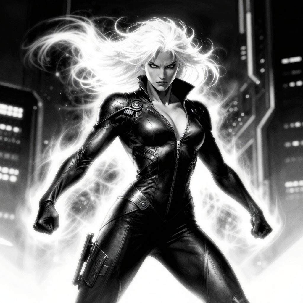 Digital artwork of a fierce, white-haired woman in a black, form-fitting leather suit, glowing with white energy, standing in a dark, futuristic