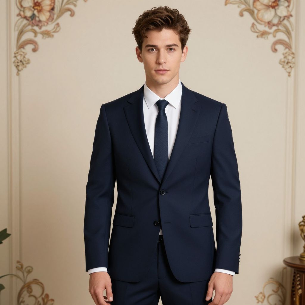 A stylish young man is portrayed in a sophisticated suit, exuding confidence and charm. The background features intricate floral elements that enhance the elegance of the composition, creating a harmonious blend of modernity and classic artistry.