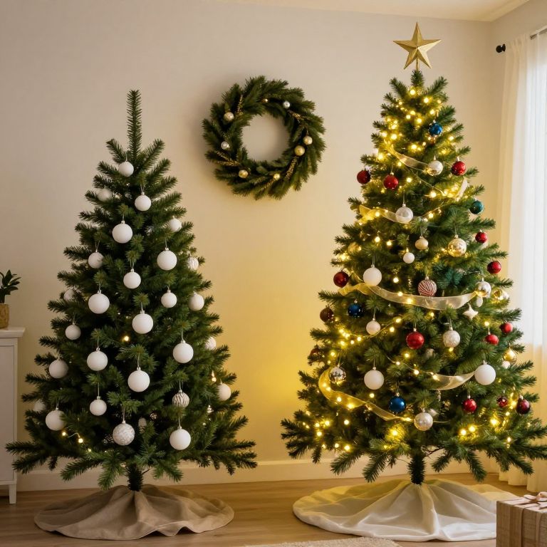 Two distinct Christmas trees showcase contrasting decorating styles: one adorned with simple white ornaments and a wreath hanging nearby, while the other is fully illuminated with warm lights, colorful baubles, and a star-topped ribbon, creating a festive ambiance in a cozy living room setting.