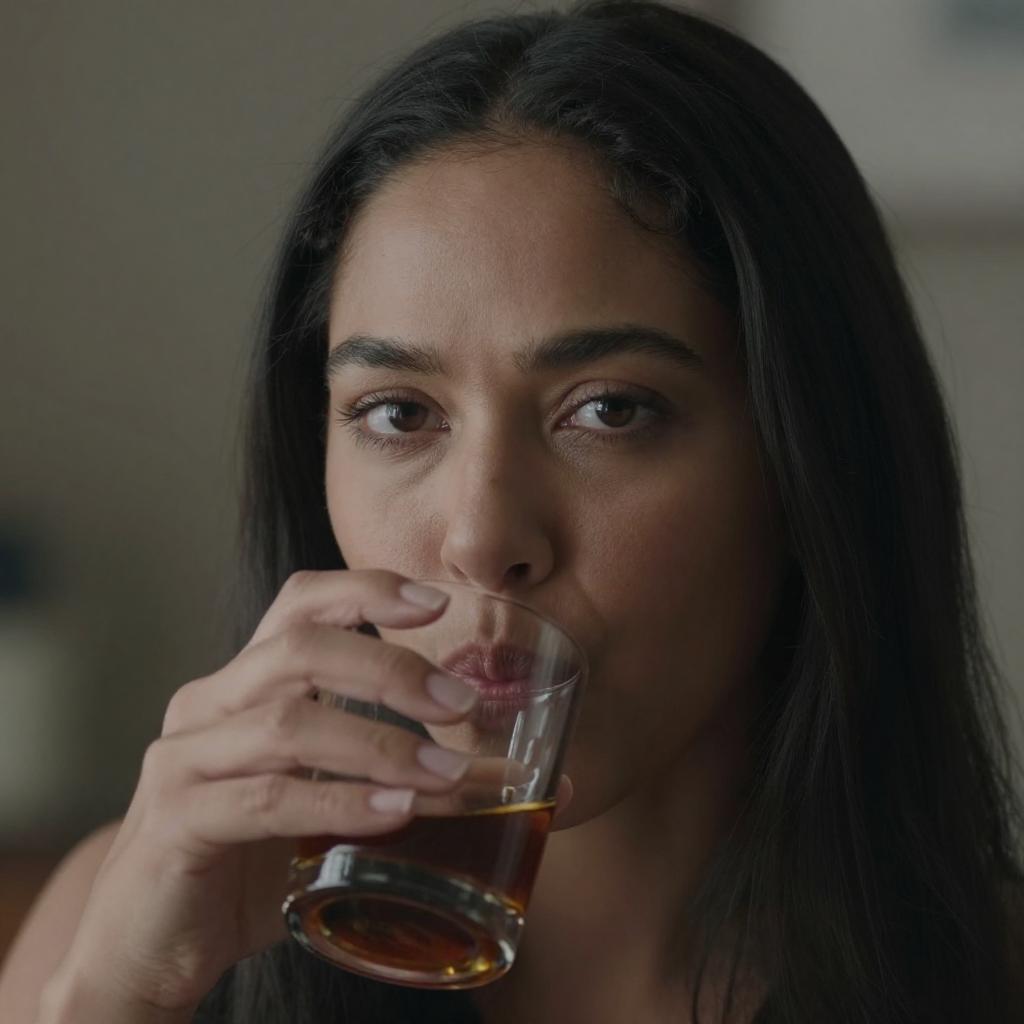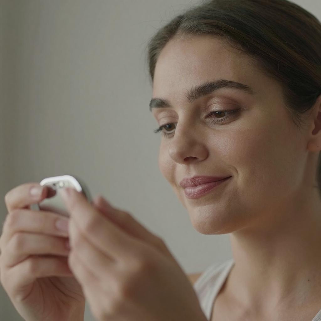 Photograph of a close-up, slightly low-angle shot of a woman with light brown skin and brown hair pulled back. She's holding a small, shiny silver object in her hands, looking down at it with a gentle smile. Her makeup is subtle with shimmery eyeshadow and nude lipstick. The background is softly blurred, highlighting her face and the object. The lighting is soft and even, creating a natural, flattering look. Depth of field is shallow, focusing on her face and the object.