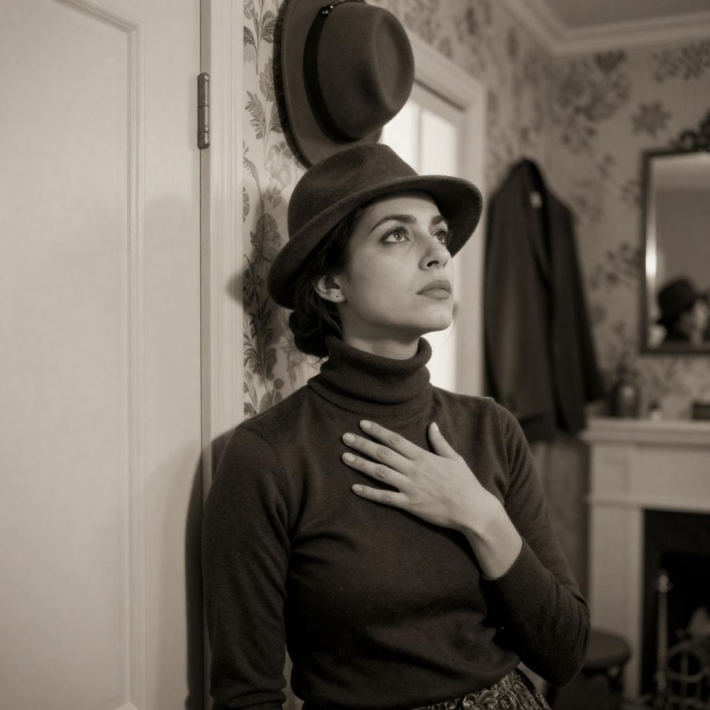 Black-and-white photograph of a woman with curly dark hair, wearing a dark hat, cloak, and light dress, sitting on a worn wooden bench against a wall with large, grid-patterned windows. Her intense gaze is directed to the side. The windows let in soft light.