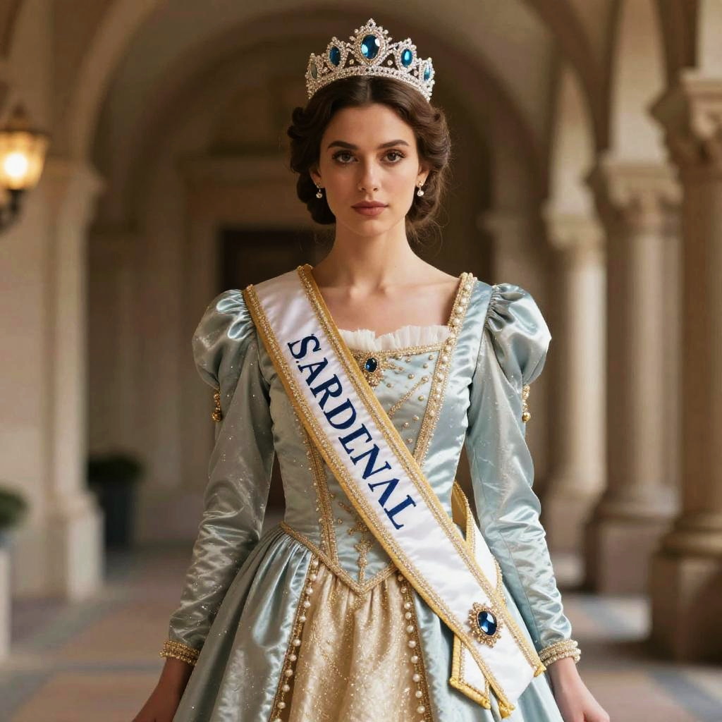 Movie Themed Costume, woman in a regal dress with a crown and a sash