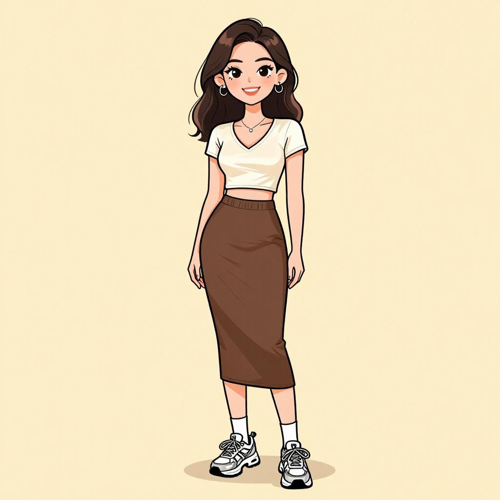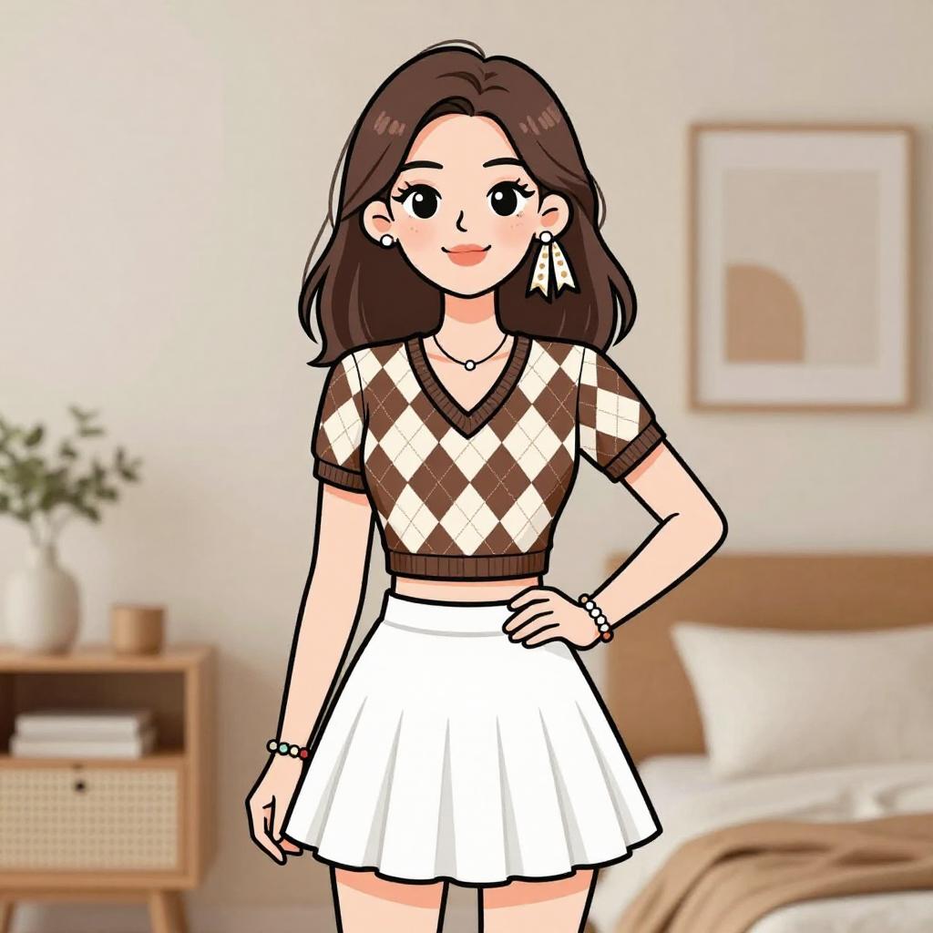 Woman with pretty face and pretty hair. smiling Woman, preppy style, brown and white argyle patterned short-sleeved crop top, V-neck, white pleated tennis skirt, high-waisted, beaded charm bracelet, layered necklace, patterned ribbon in hair, bedroom with decor and plants in the background --sref 1467
