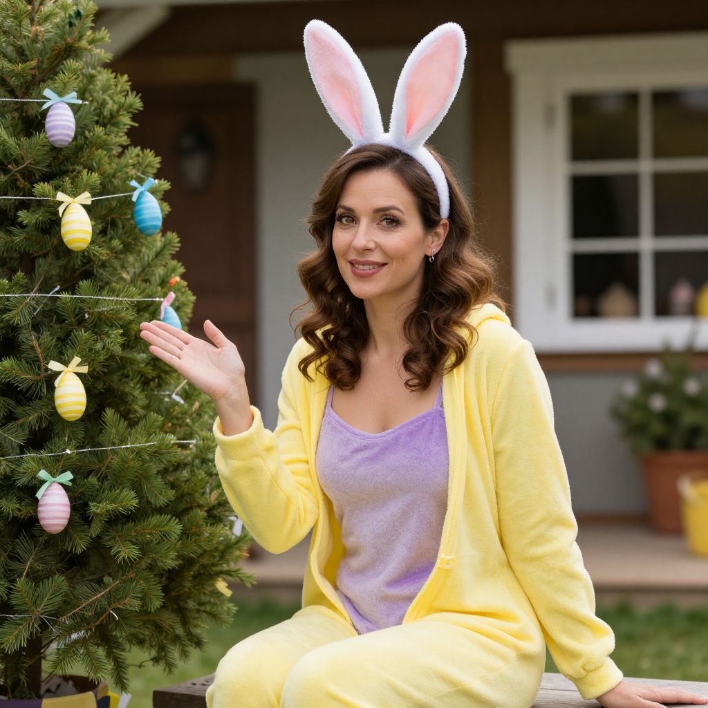 An adult woman in her late 30s with warm brown eyes and wavy brown hair dressed in a yellow and purple Easter bunny costume, sitting on a garden bench outside a farmhouse, looking happily at a decorated Easter tree in the garden behind her.