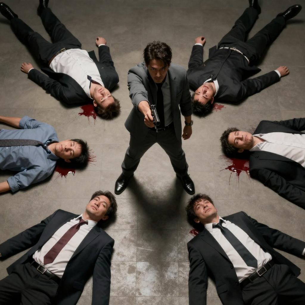 Two men lying on tiled ground, one on top, both bloodied, gray plaid jacket, black cap, intense facial expressions, blood splatter.
