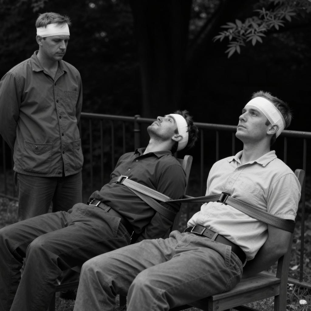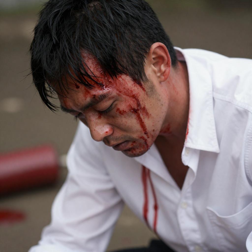 Two young men lying on a tiled floor, both wearing gray plaid jackets and black caps. Their faces and necks show blood splatters and bruising, with intense facial expressions. The image conveys a dramatic and intense moment with a neutral urban background.