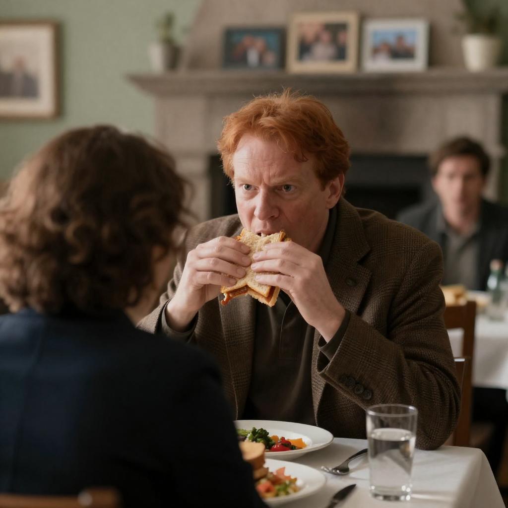 Photograph of a middle-aged man with red hair, wearing a grey suit, white shirt, and red checkered tie, looking up with wide eyes. He is leaning against a blue-framed glass window, with a camera lens visible in the lower left. Background: clear blue sky with white clouds. His right arm is raised, gripping the window frame.