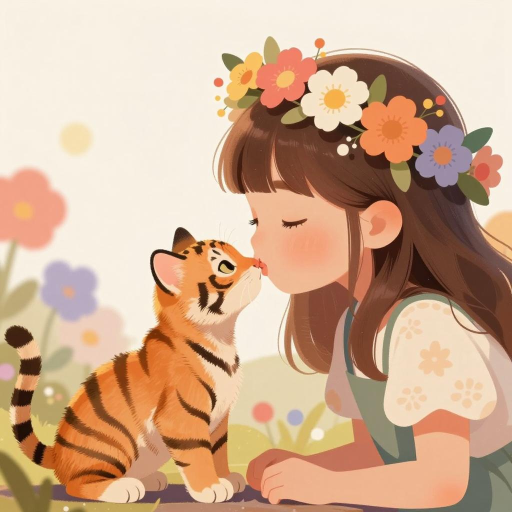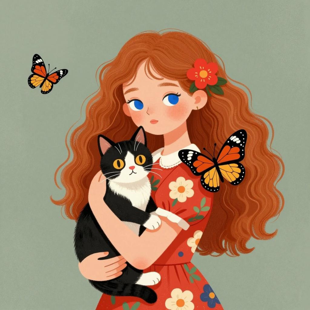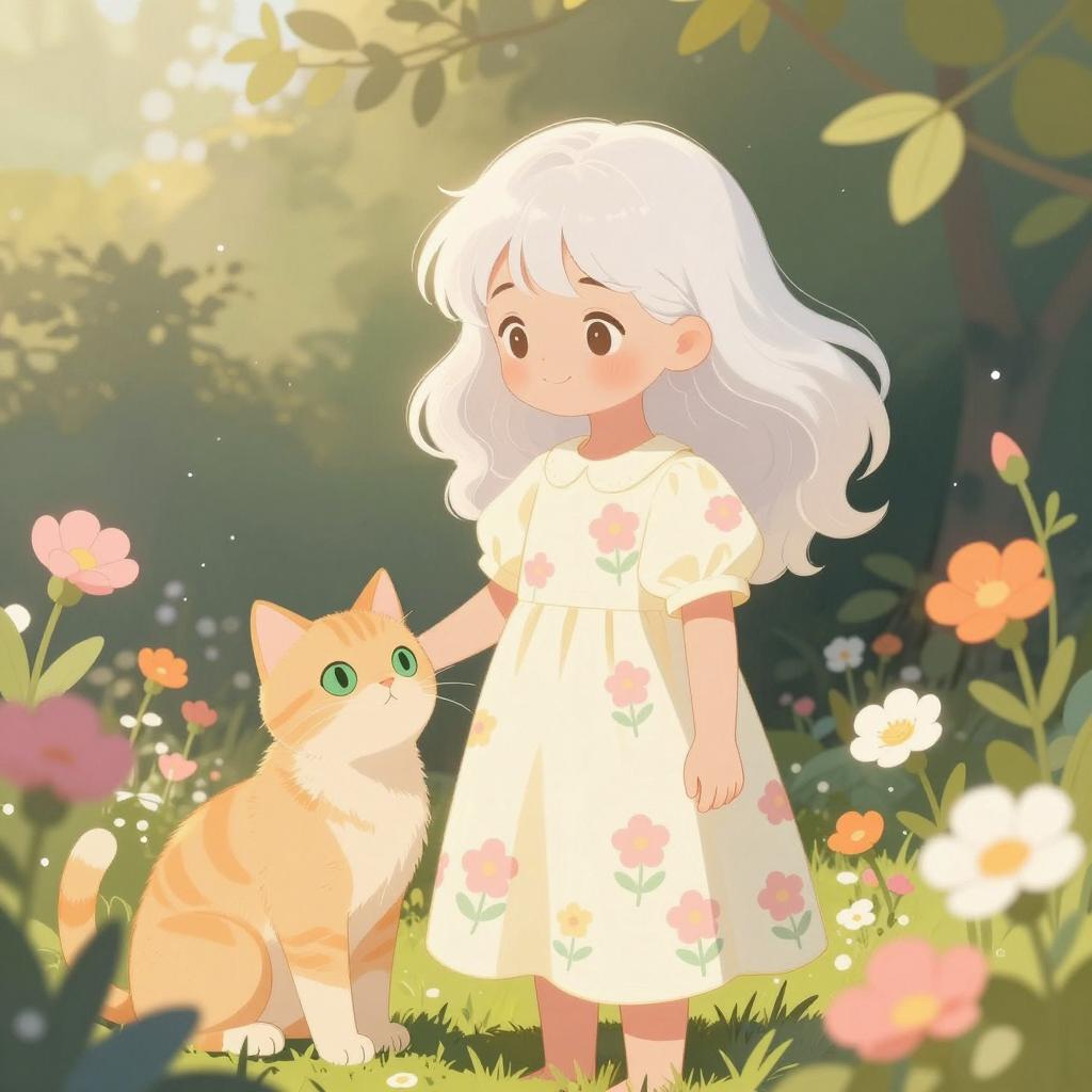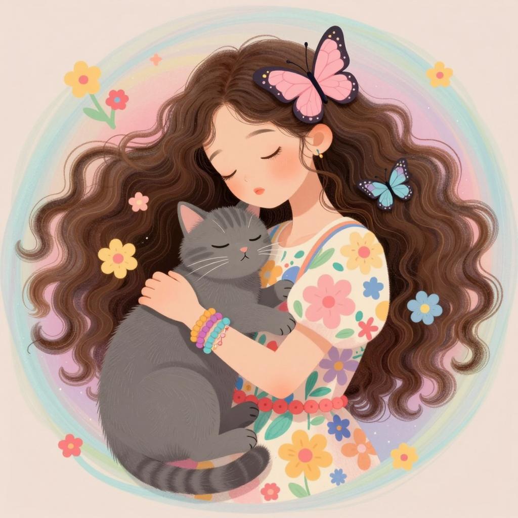 Illustration of a young girl with long brown hair, wearing a pink dress and white sandals, sitting on the ground with her hands on her cheeks, looking up with a soft smile. A gray cat with green eyes sits beside her, looking to the left. Bright, colorful, floral background with splashes of pink, green, and blue. Girl's dress has fluffy, ured fabric. Cat's fur is detailed and fluffy. Girl is centered, cat to the left.