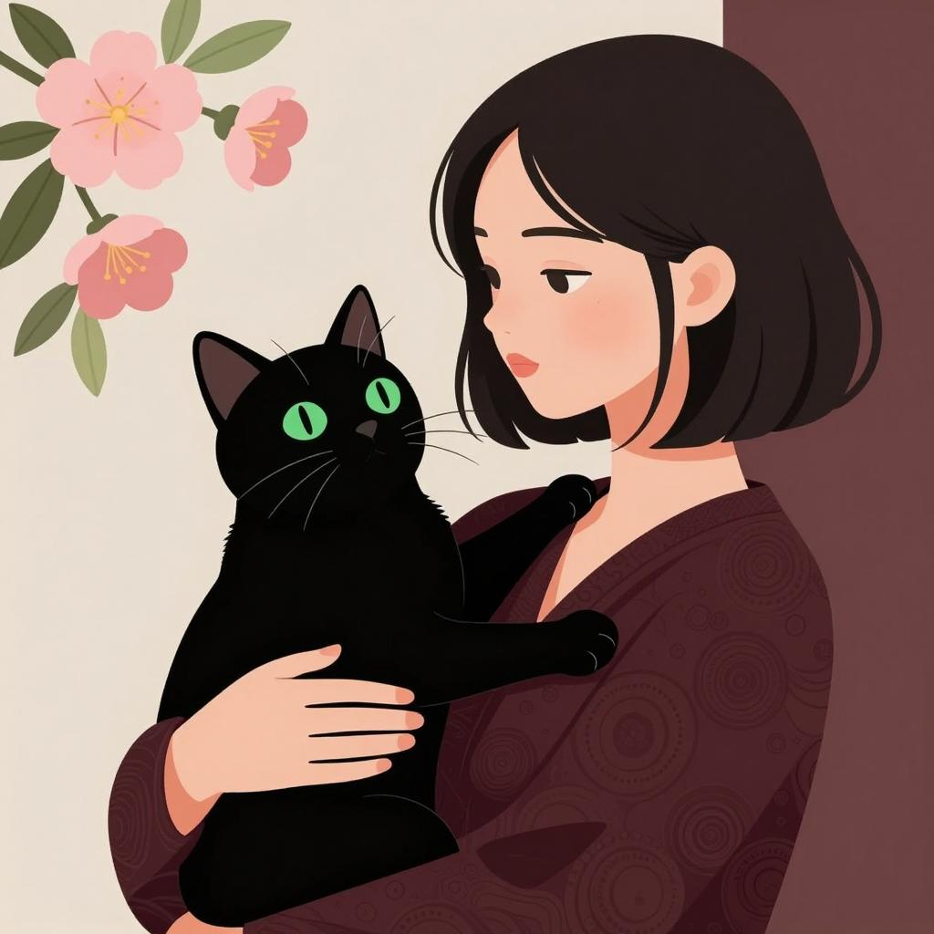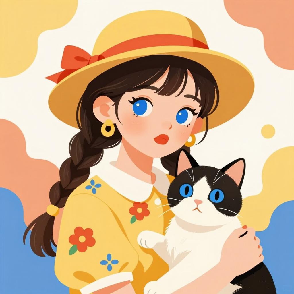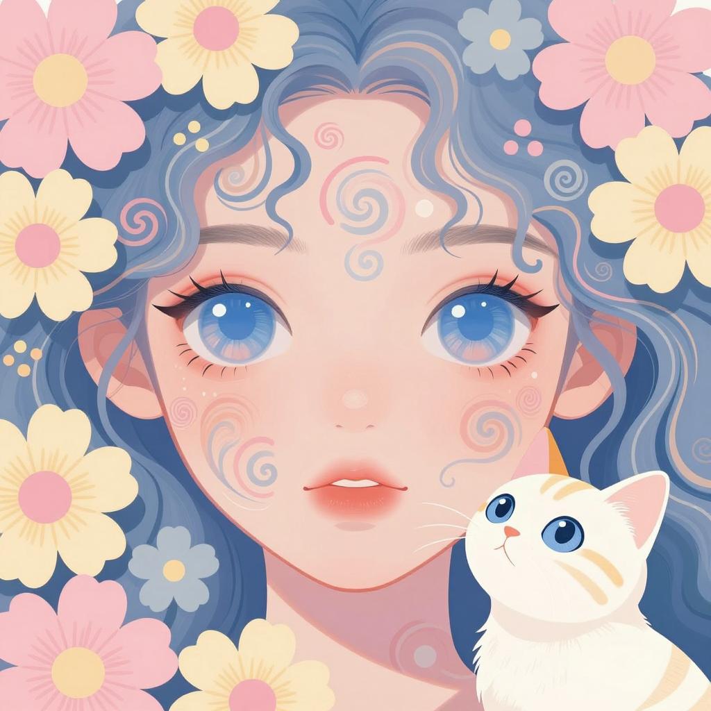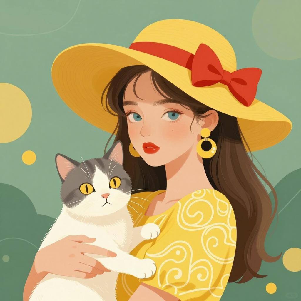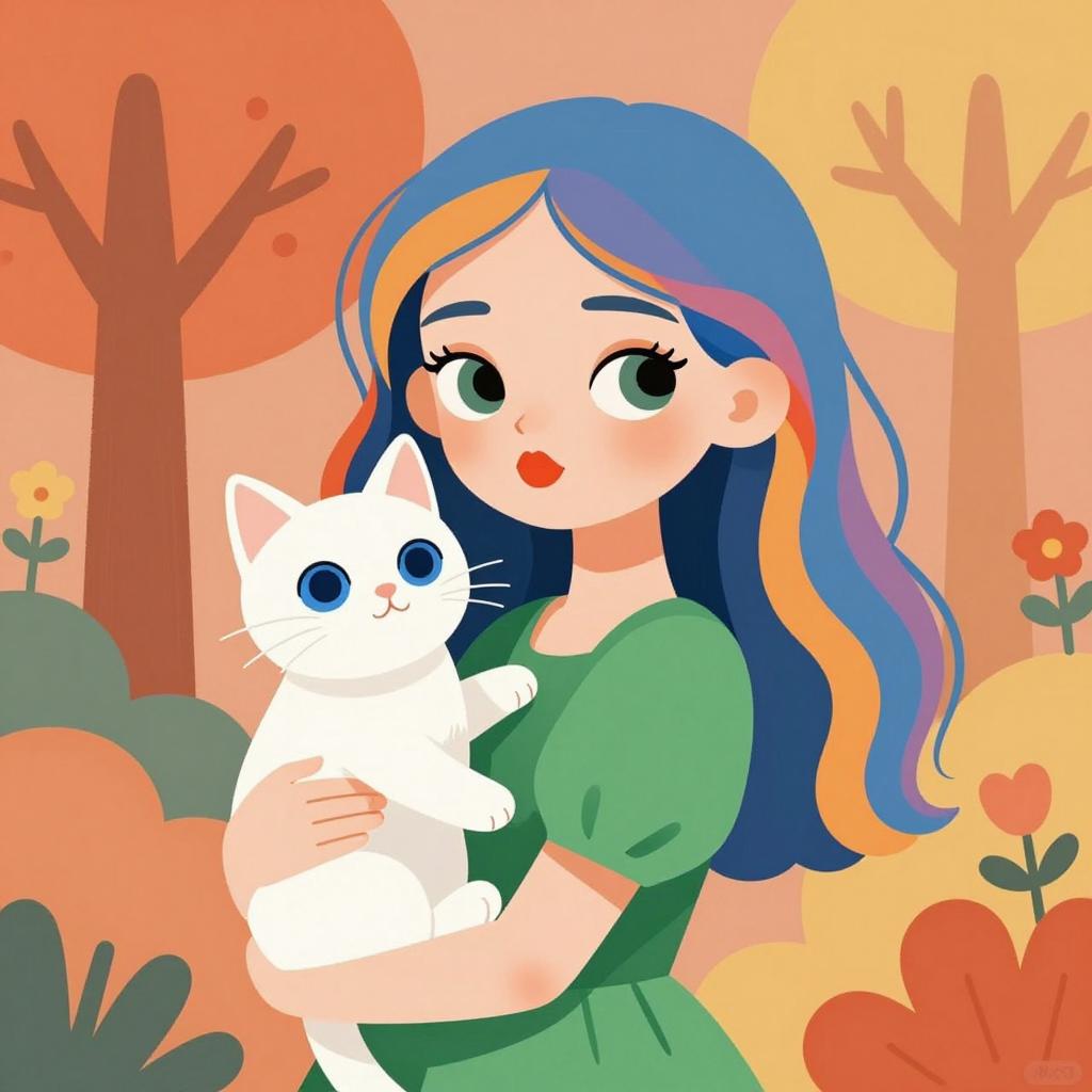 Illustration of a young girl with long brown hair, wearing a pink dress and white sandals, sitting on the ground with her hands on her cheeks, looking up with a soft smile. A gray cat with green eyes sits beside her, looking to the left. Bright, colorful, floral background with splashes of pink, green, and blue. Girl's dress has fluffy, ured fabric. Cat's fur is detailed and fluffy. Girl is centered, cat to the left.