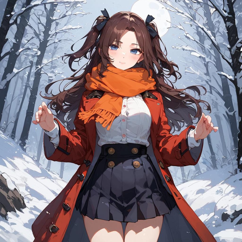 Score_4, score_5, score_6, score_9, score_8_up, score_7_up, source_anime, TohsakaRin, 1girl, closed mouth, blush, brown hair, two side up, parted bangs, blue eyes, hair ribbon, RinCoat, red coat, black skirt, long sleeves, pleated skirt, orange scarf, buttons, looking at viewer, thigh gap, night, forest, snow, moon