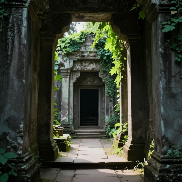 Enveloped in the ethereal glow of ancient stone and creeping greenery, this sacred corridor whispers a symphony of serenity and introspection, where the weight of history meets the promise of renewal.