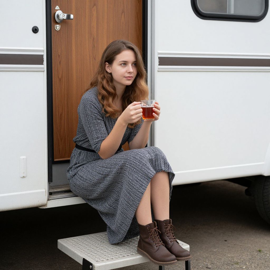 Woman Relaxing with Tea by Caravan
