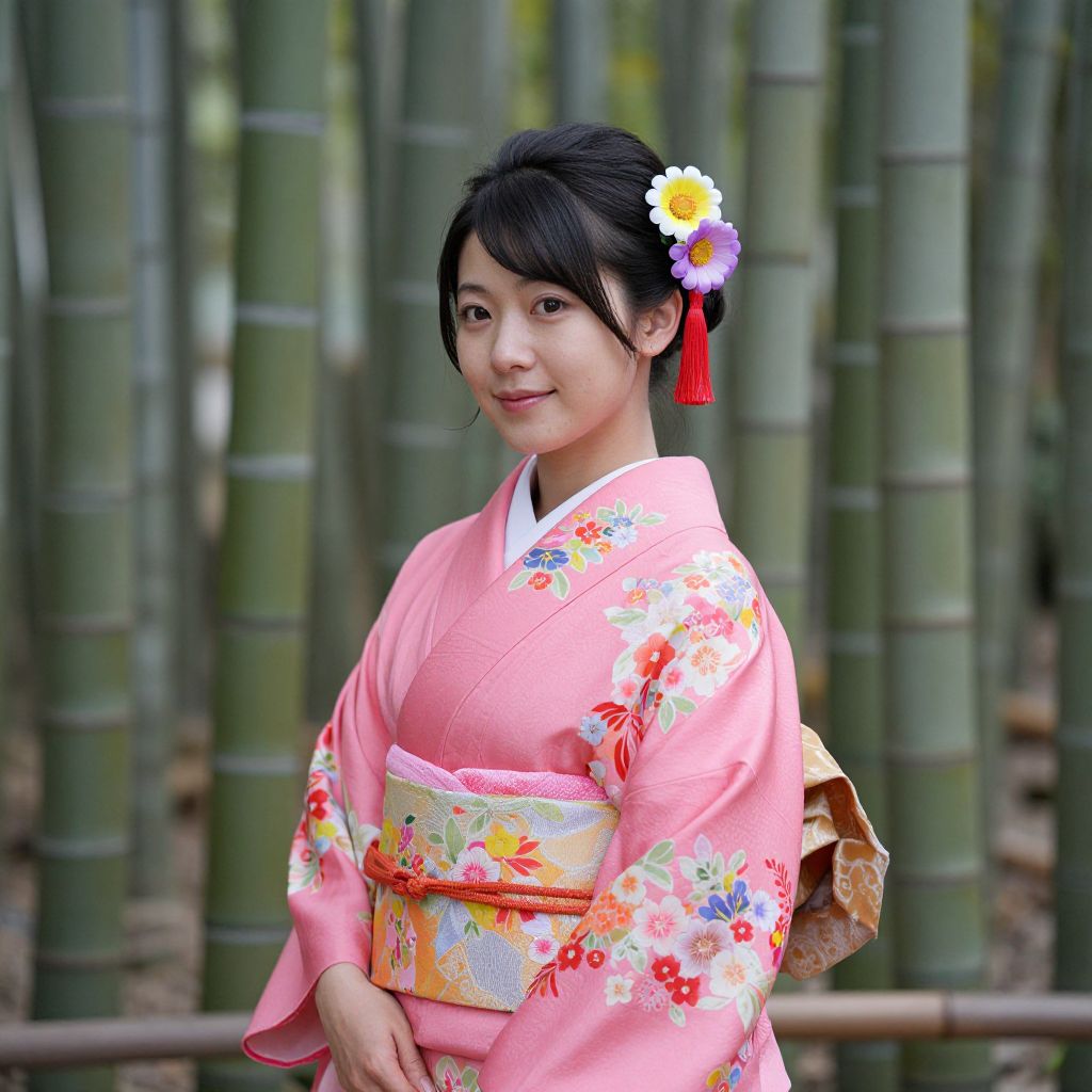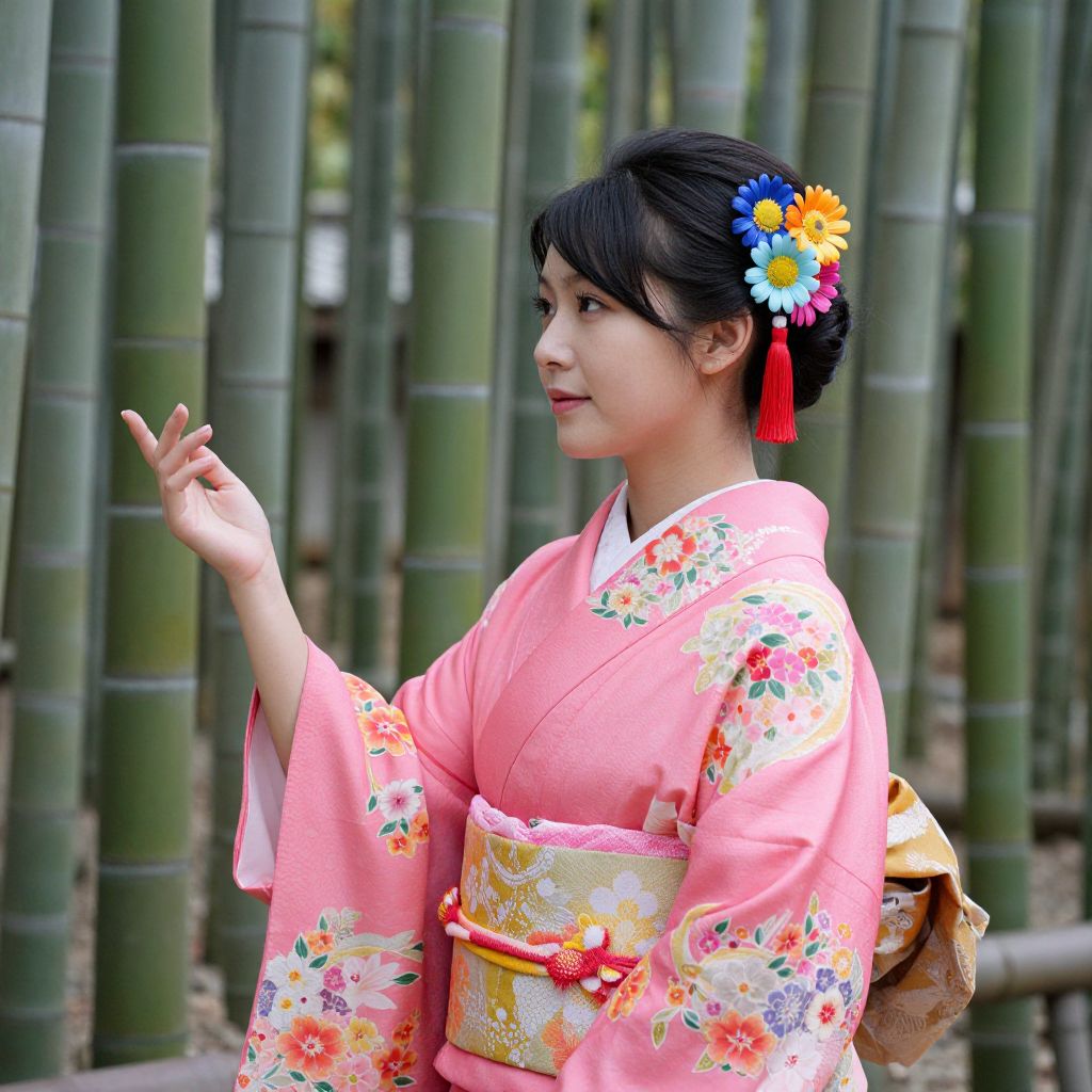 Asian woman gracefully standing amidst a serene bamboo forest in Kyoto, Japan, adorned in a vibrant pink kimono embellished with floral patterns, complemented by a striking hair accessory featuring three colorful daisies and red tassels.