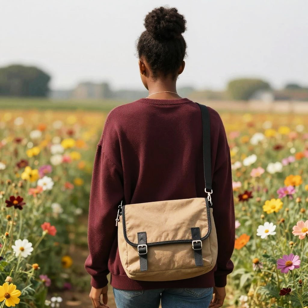 Low bun, black girl with maroon sweater and messenger bag standing in a field of flowers