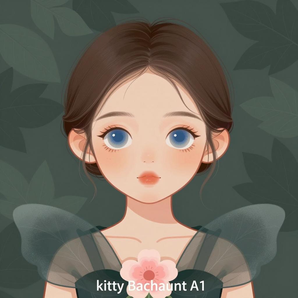 Digital illustration of a young girl with large blue eyes, fair skin, and full lips. She has brown hair in a loose bun, wearing a dark, translucent, wing-like garment with a pink flower at the center. The background is dark green with leaf patterns. The girl's expression is neutral and direct. Artist's name "kitty Bachaunt A1" is at the bottom.