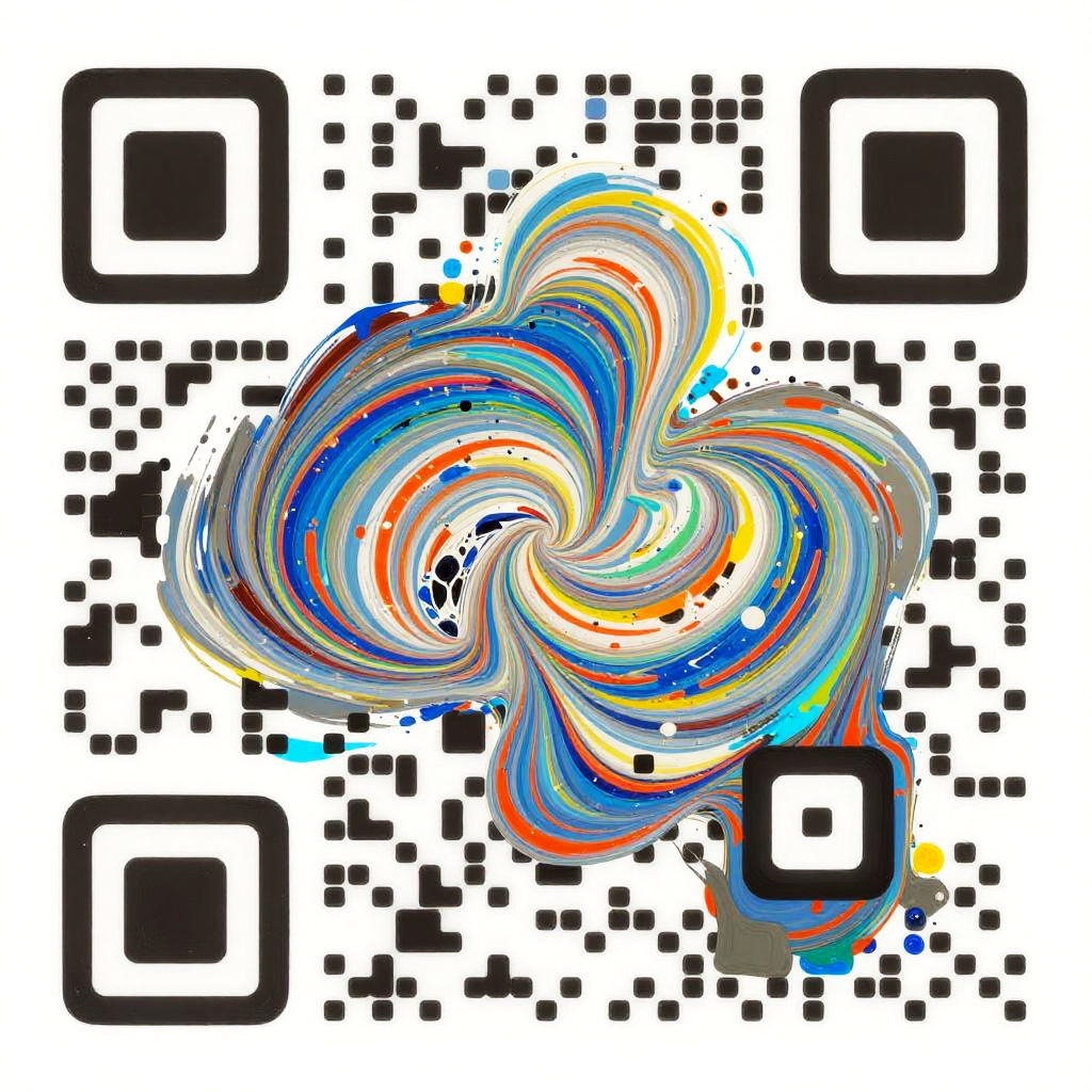 Abstract digital painting of an AI art QR code generator outputting a QR code made of swirling paint strokes and pixels, vibrant and colorful, modern art style, dynamic composition