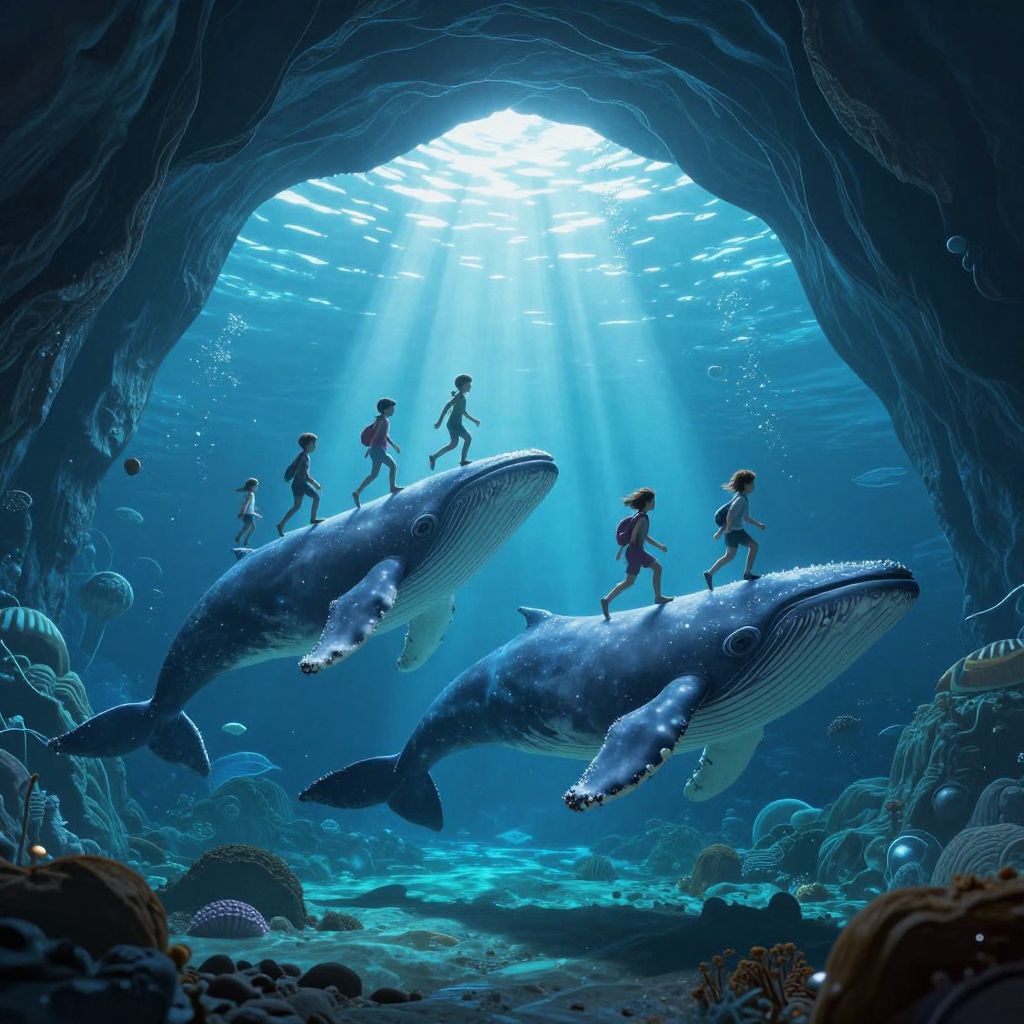 In a surreal digital artwork rendered in high-definition detail, children traverse the gravity-defying backs of majestic whales as they navigate through a luminous underwater cave, their silhouettes illuminated by ethereal light filtering through the cavern's opening.