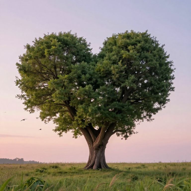 Loving heart-shaped tree in the middle of a peaceful meadow, branches intertwining delicately, soft pastel sky at dawn, birds flying gently, emphasis on tender and nurturing nature, rich textures on bark and leaves, dreamy and tranquil mood
