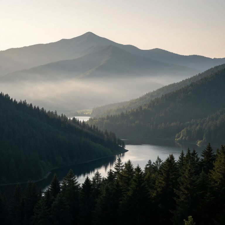Photograph of a serene mountain landscape at dawn, featuring a mist-covered lake surrounded by dense, dark green pine forests and layered, shadowed hills under