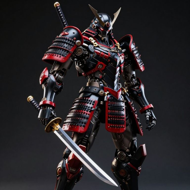 The image depicts a highly detailed and intricate mechanical samurai, standing in a dramatic, darkened setting. The mech is adorned with a complex array of armor plates, predominantly black with red accents, and is equipped with a pair of samurai swords, one in each hand. The swords are sharp and gleaming, contrasting sharply with the dark background. The mech's head is helmeted with a visor, featuring a menacing, mechanical design with glowing red eyes, giving it a formidable and otherworldly appearance. The armor is meticulously crafted, with various mechanical components and joints visible, adding to the futuristic and advanced feel of the design. The overall composition is dynamic, with the mech positioned centrally, its stance suggesting readiness for battle. The interplay of light and shadow enhances the mechanical textures and the intricate details of the armor, creating a visually striking and compelling image.