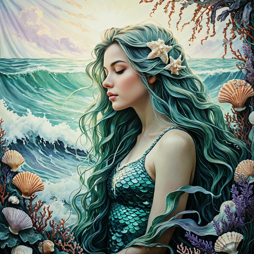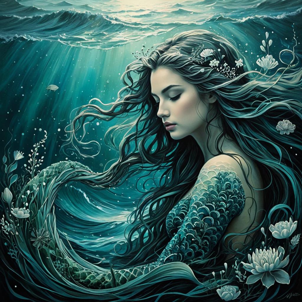 A serene, artistic portrait of a child in a surrealist style. Her gleaming, flowing hair merges seamlessly with swirling waves of the ocean, conveying a calm and contemplative expression. Her scales transforming into a tapestry of seaweed and coral blends harmoniously with nature, transforming into a cascade of flowers and leaves. The background is an ethereal mix of underwater garden and shimmering light rays with soft hues of emerald, teal, and hints of silver. Gentle light reflects off her face, creating a mystical, dreamlike atmosphere. Rendered with soft brush strokes, the piece is highly detailed and vivid, evoking tranquility and wonder.
