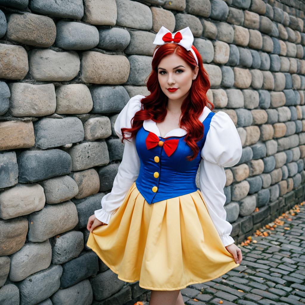 Riddler costume gotham, photograph of a woman with long red hair, green bow, wearing a green and purple costume, green suit with purple tie, green gloves, standing against a brick wall, realistic, colorful, cosplay, confident expression, daytime lighting, detailed ures