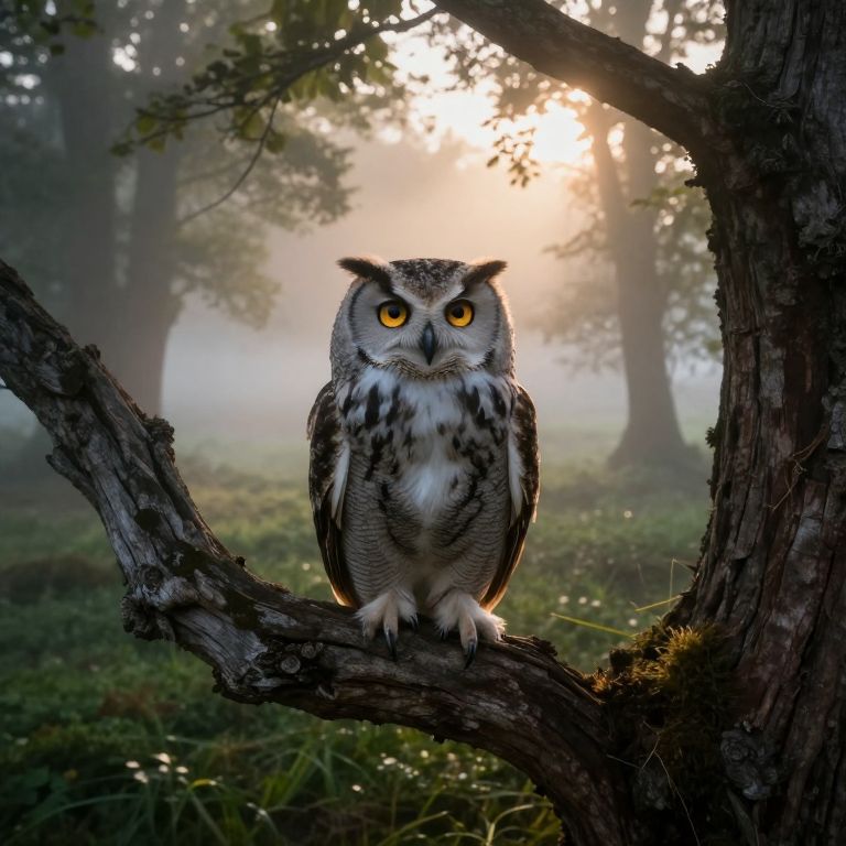 An enchanting portrait of a wise old owl in the serene tranquility of a misty forest glade at dawn, captured from a unique aerial perspective as if viewed through the lens of a soaring eagle. The majestic bird sits upon an ancient gnarled tree trunk, its piercing golden eyes reflecting both wisdom and mystery. The ethereal glow of the early morning light filters through the dense foliage above, casting a kaleidoscope of soft shadows across the scene and bathing the owl in a warm, inviting radiance. This captivating image artfully blends the realism of wildlife photography with the atmospheric mystique of a dreamlike fairy tale setting, evoking a sense of awe and wonder at the beauty and enigma of nature's creatures.