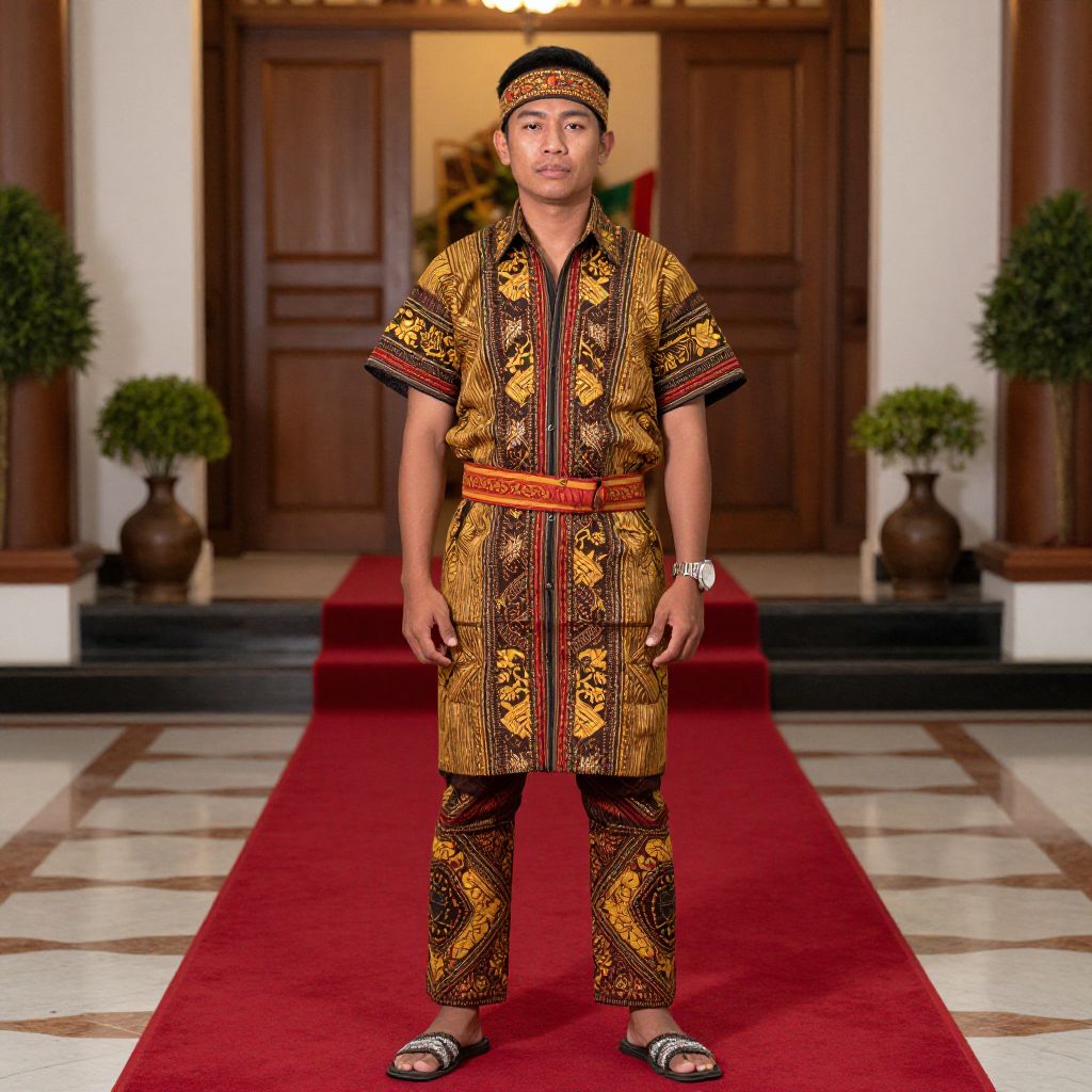 Photograph of a man in traditional Southeast Asian attire, standing on a red carpet in front of wooden doors, wearing a matching patterned tunic,