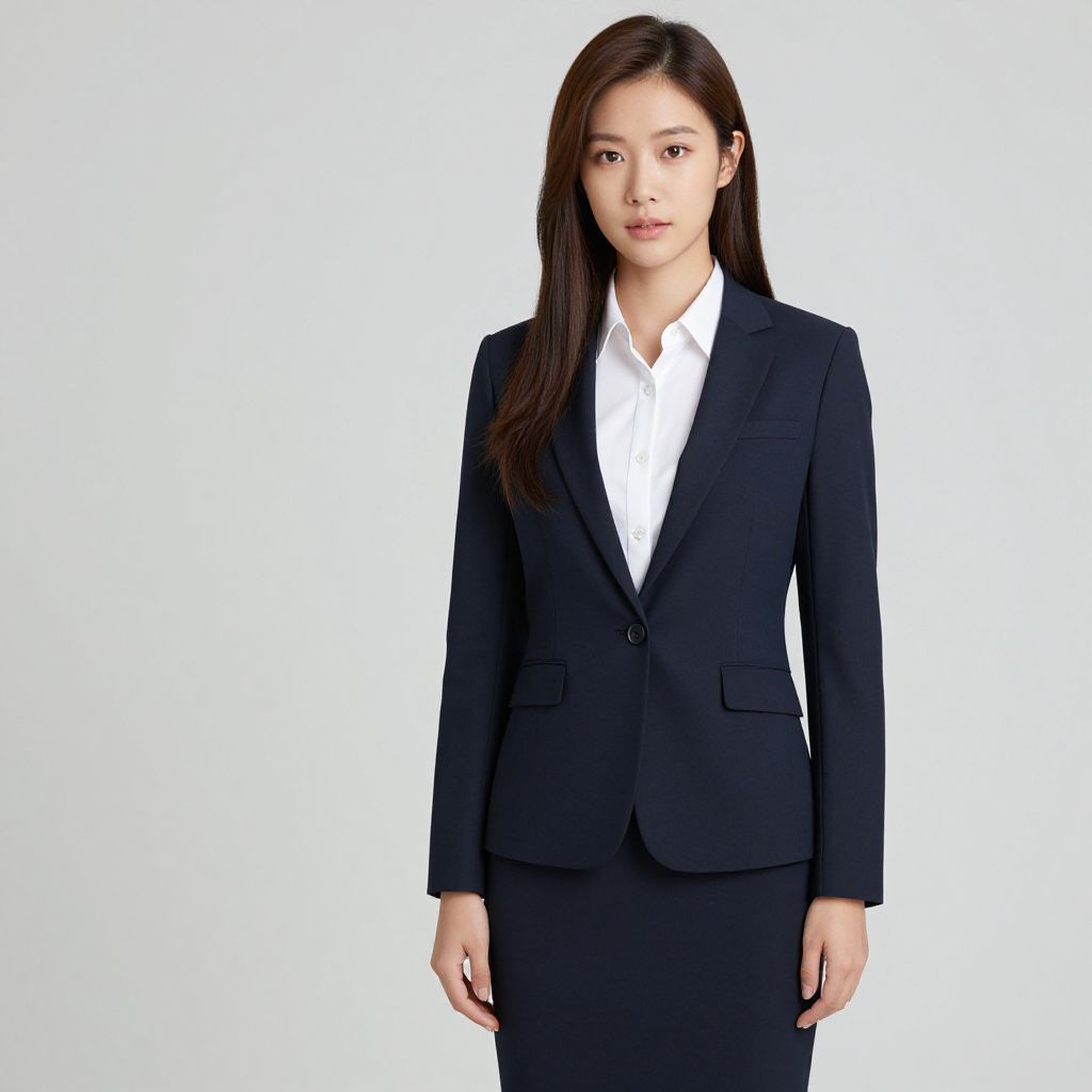 Photograph of an Asian woman with long, straight, dark brown hair, standing against a plain white background. She wears a black business suit with a fitted blazer and matching skirt, over a crisp white dress shirt. Her expression is neutral, and she gazes directly at the camera. The suit is well-tailored, emphasizing her slim figure. The lighting is bright and even, highlighting the textures of the fabric and her smooth complexion. The image has a clean, professional look, typical of corporate headshots.