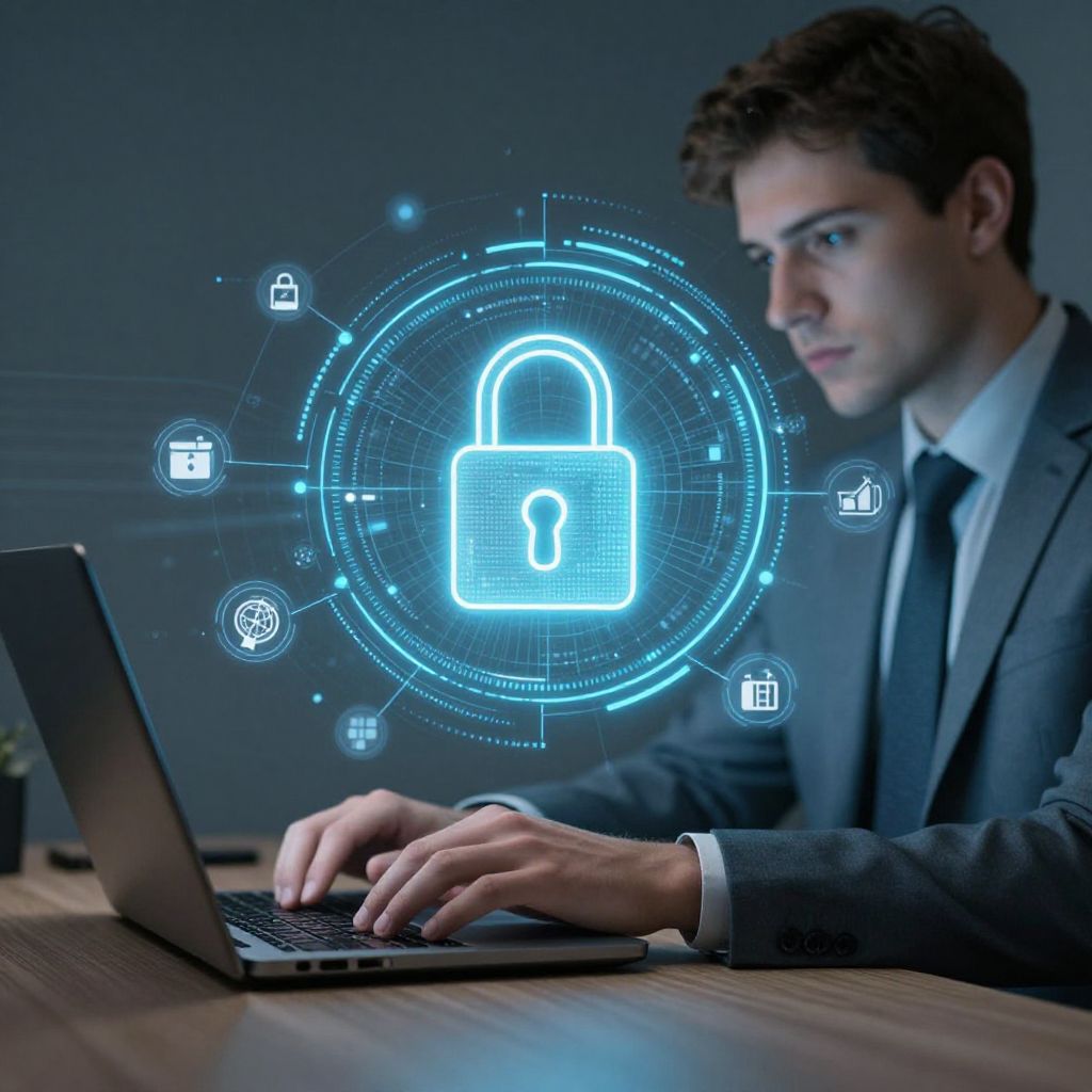 Photograph of a young, Caucasian man with short, curly brown hair, wearing a dark gray suit, white shirt, and black tie, typing on a laptop. He has a focused expression. In the background, a glowing blue digital lock with interconnected icons (key, password, security, and encryption) surrounds the lock, floating in front of a dark gray wall. The laptop is on a wooden desk, and the overall scene has a modern, tech-savvy feel with a cool blue and gray color palette. The digital elements are semi-transparent and ethereal, contrasting with the realistic setting.