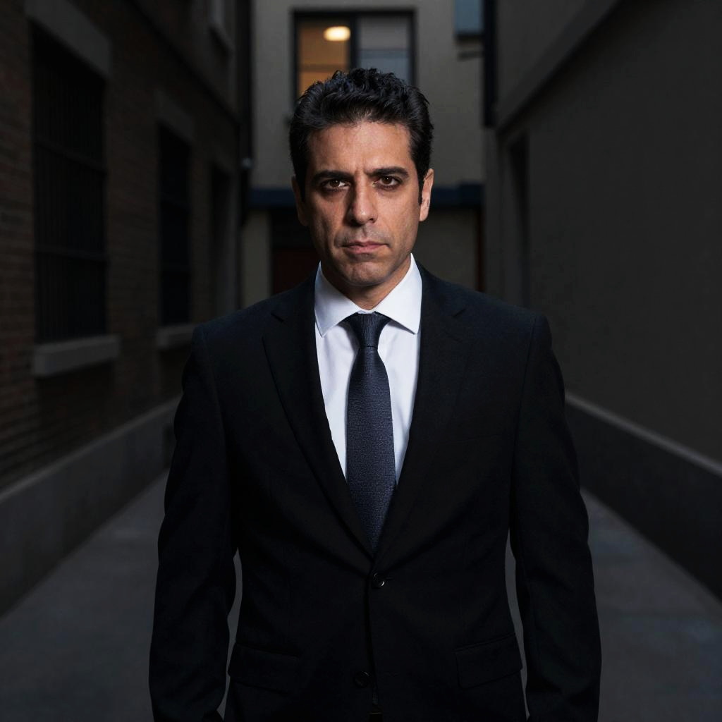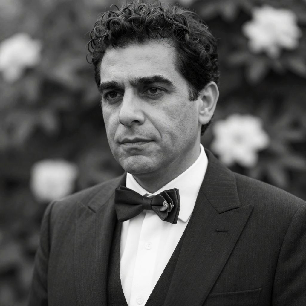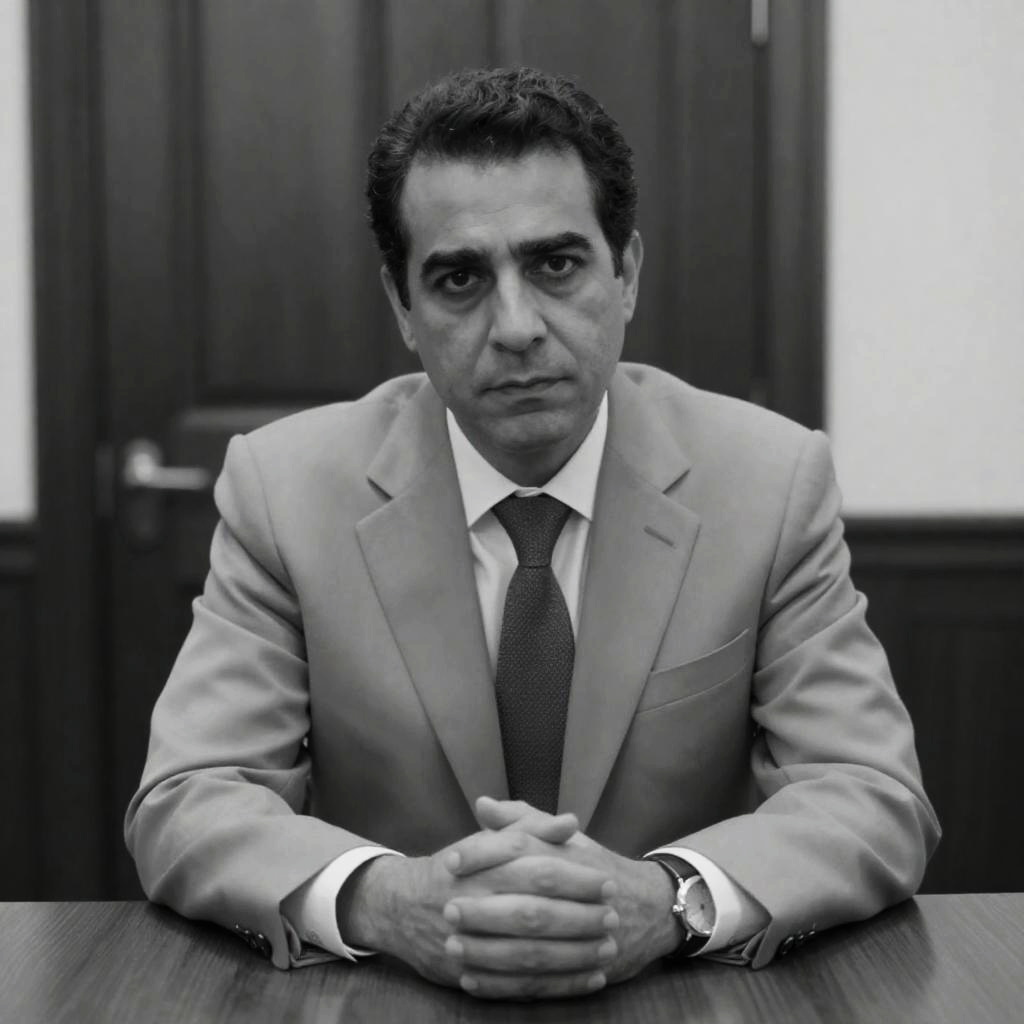 Black and white photograph of a middle-aged man with dark hair and a serious expression, wearing a light-colored suit and tie, sitting with hands clasped on a wooden table. Background has a dark wooden door and wall.