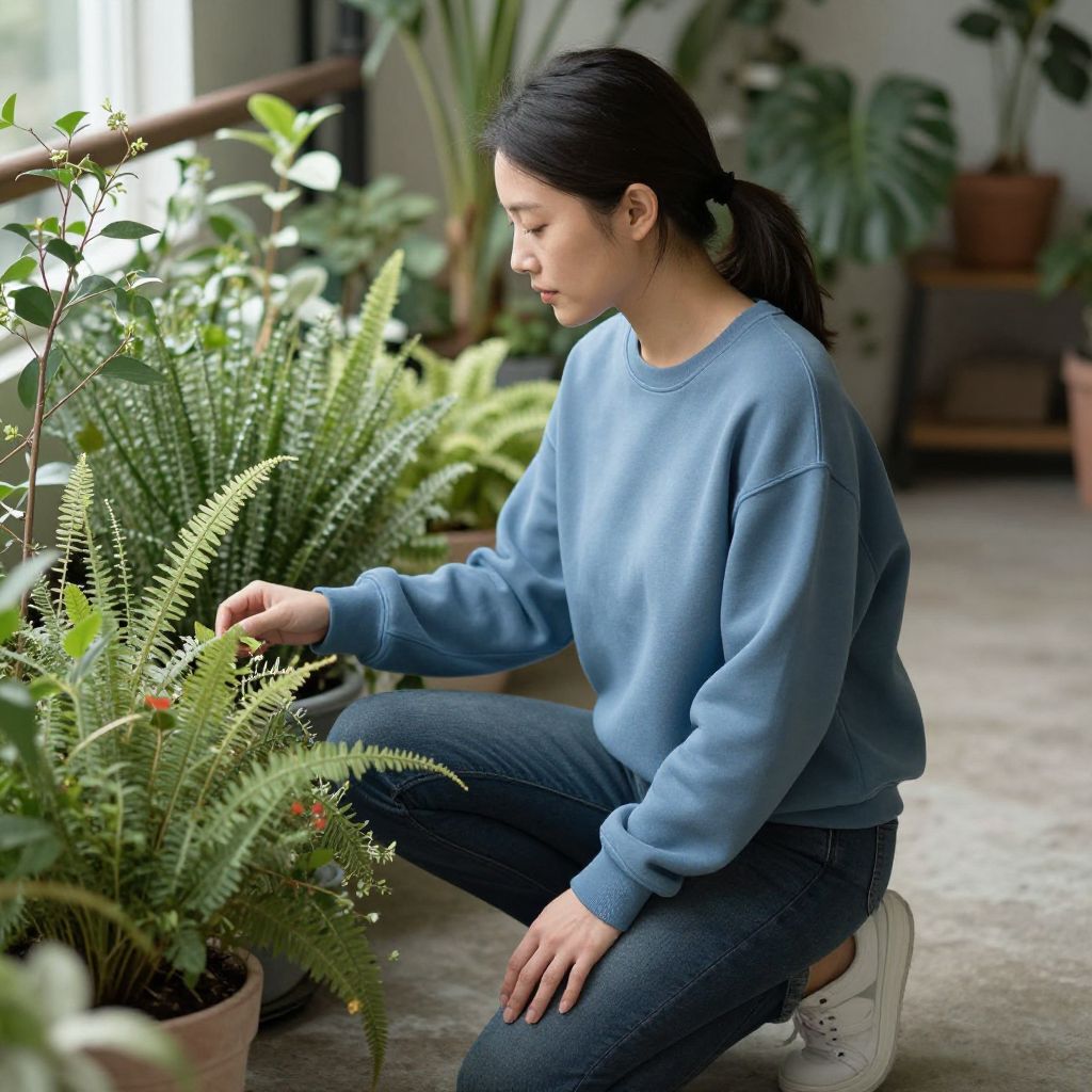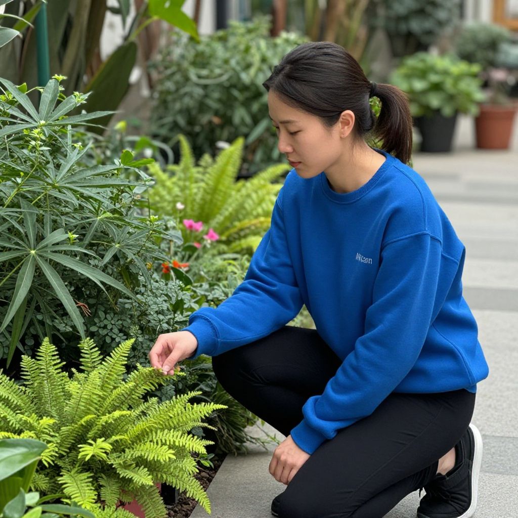 Photograph of an Asian woman with straight, black hair in a ponytail, wearing a royal blue sweatshirt and black pants, squatting in a lush, outdoor garden. She gently touches a vibrant green fern plant. The background features various potted plants, including tall green leaves and small pink flowers. The woman appears focused and calm. The scene is brightly lit with natural light, highlighting the greenery and her blue sweatshirt. The setting suggests a botanical garden or nursery.
