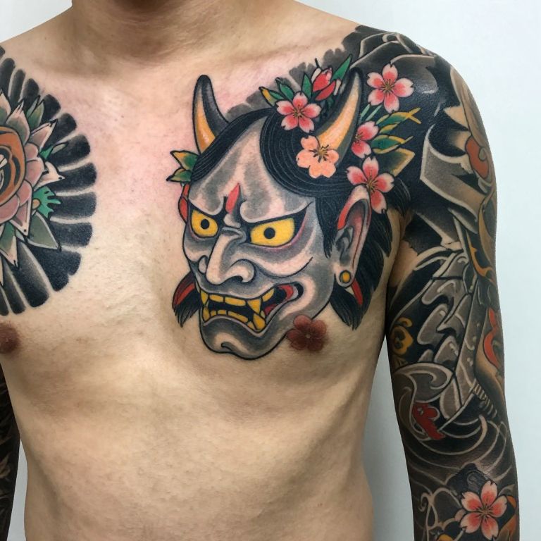 Photograph of two Asian men with vibrant, colorful tattoos: one back tattoo of a fierce mask, the other chest tattoo of a skull with flames and