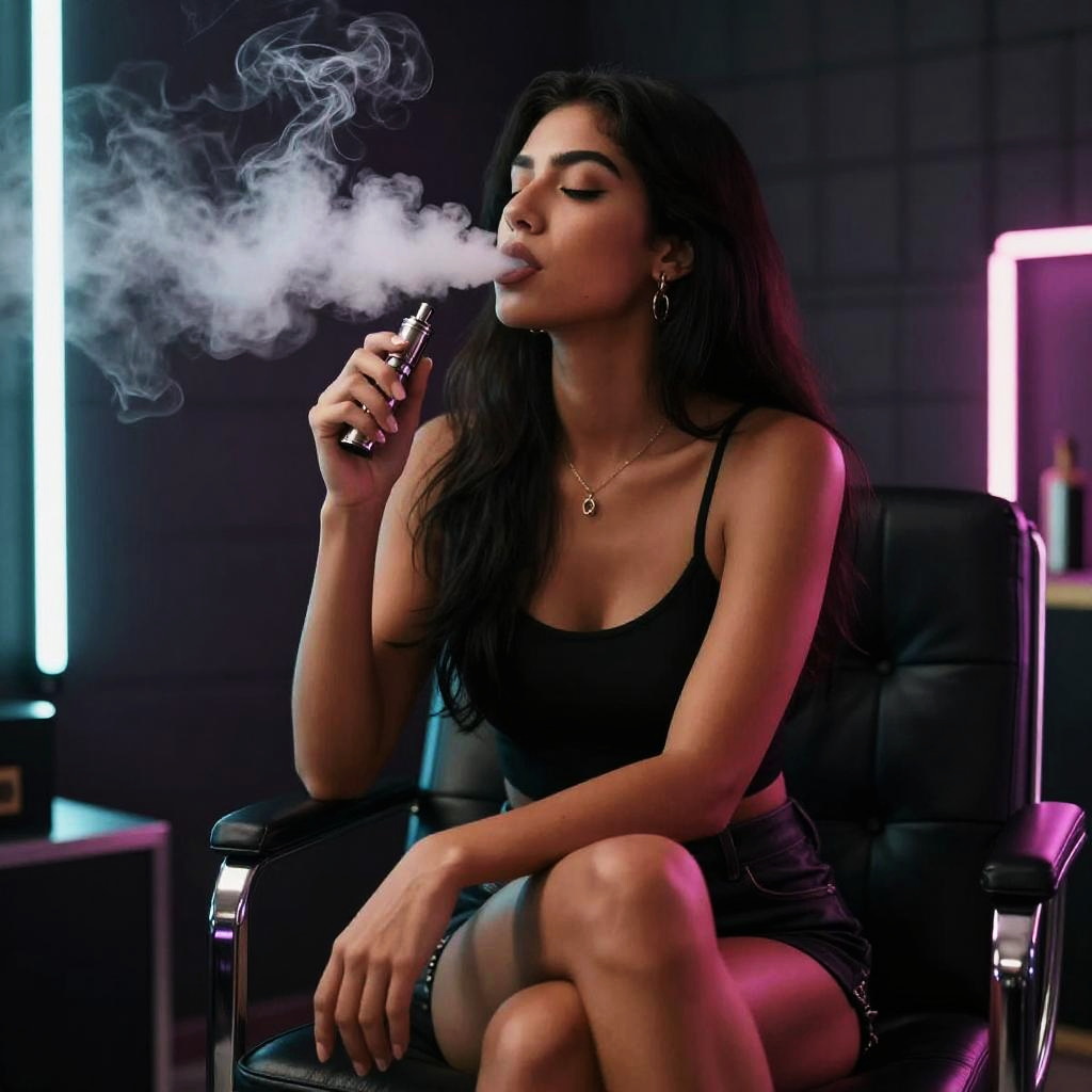 Photograph of a woman with long dark hair and tan skin sitting in a dimly lit, modern room with neon lights. She's wearing a black top and shorts, exhaling a large cloud of smoke from a vape. She's holding a vape pen in her right hand, and her eyes are closed. The background features a quilted wall and a sleek, dark chair.