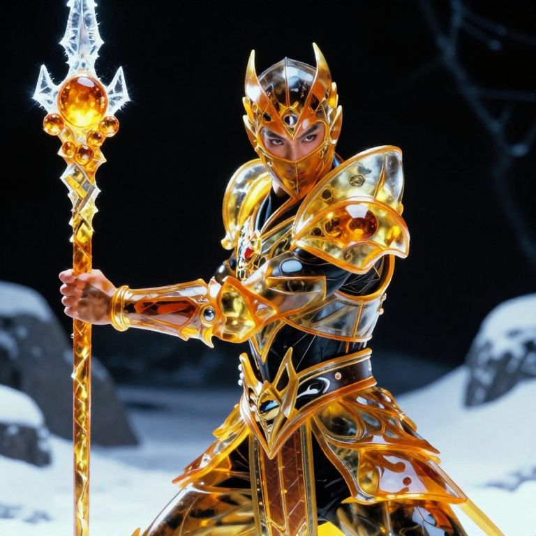 Extreme Upper Body Closeup Portrait, Vibrant Amber and golden-black color graded, AmanoER, analog Photo of a wizard with a staff full of crystals, the crystals are round golden amber, hkevil ninja-goddess, action pose, featuring a stylized, a ninja with translucent Amber ice-based powers, He is depicted standing in a snowy, shadowy background, giving an action pose, Casting a spear Made of ICE and frost, The blue dark-orange-yellow outlines and defines the character's muscular physique, ornate suit of armor, The armor includes a translucent amber and black chest piece with intricate Design