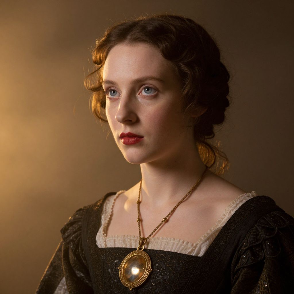 This is a photograph of a fair-skinned woman with blue eyes and reddish-brown, wavy hair styled in an early 20th-century updo. She wears a black, lace-trimmed dress with puffed sleeves and a gold chain necklace featuring an oval, glowing pendant. Her red lips and subtle makeup enhance her delicate features. The background is a warm, gradient brown, with a soft light source from the left, casting a gentle glow on her face and highlighting her hair. The overall style is reminiscent of early 1900s portraiture.