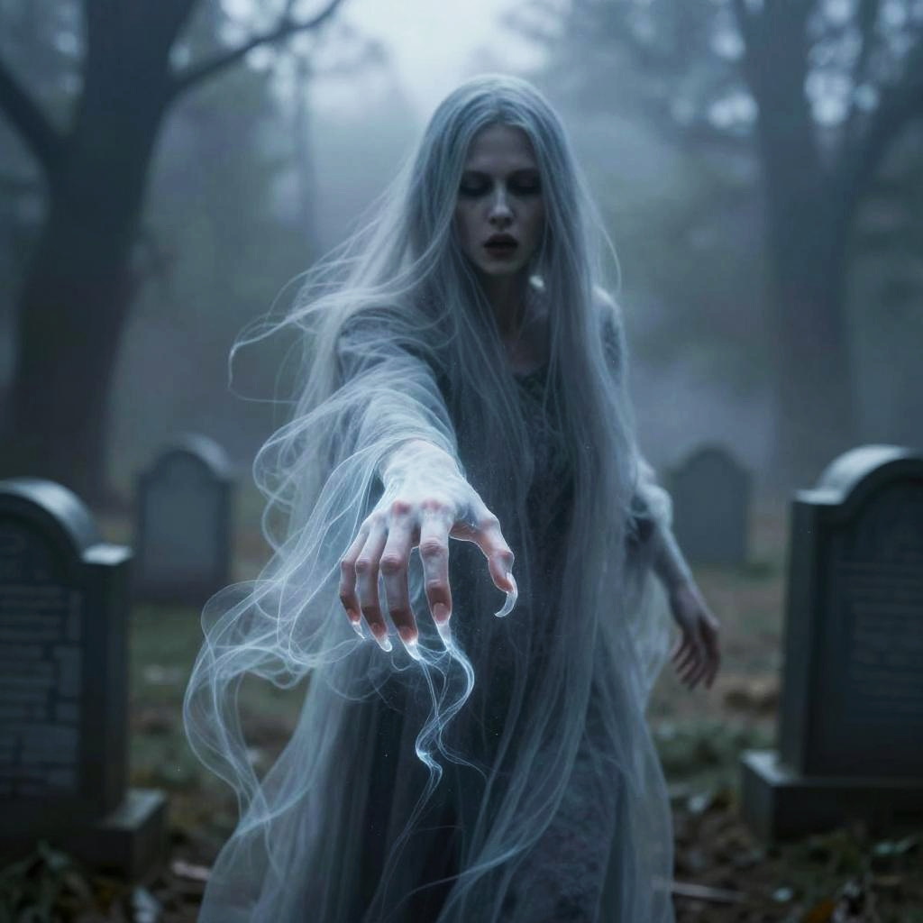 Phantom specter gliding through a fog-filled graveyard at dawn, tombstones obscured by dense mist, glowing eyes piercing the gloom, ethereal tendrils trailing behind, mysterious and somber mood with soft pastel sunrise colors contrasting ghostly figure