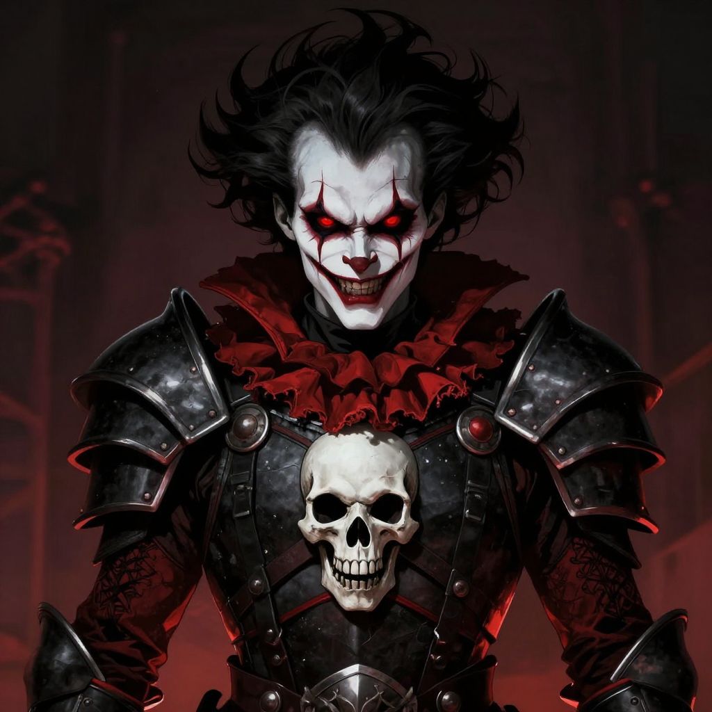 Digital illustration of an evil clown warrior character with pale skin, red glowing eyes, and sinister makeup. The character wears black and red armor with metal straps and a prominent skull emblem on the chest. The design conveys a dark, gothic, and intimidating fantasy theme.