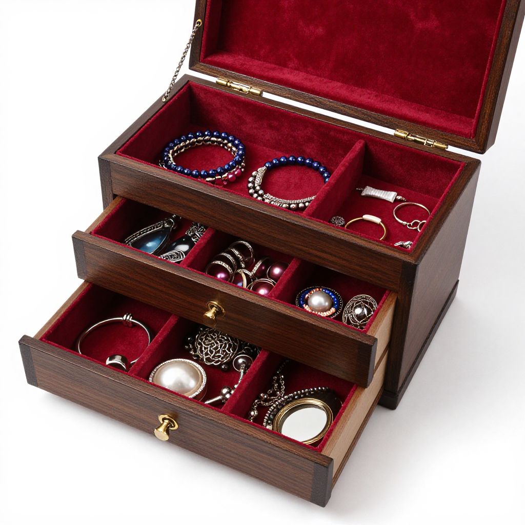 Elegant wooden jewelry box with two drawers, each containing six compartments filled with a diverse collection of costume jewelry, including bracelets, rings, and decorative pieces, all set against a rich red velvet interior.
