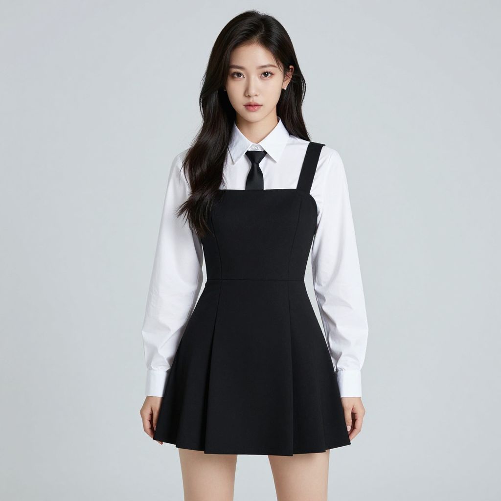 Photograph of an Asian woman with long, straight black hair, wearing a white long-sleeved shirt with a black tie, paired with a black sleeveless dress. The dress has a fitted waist and a flared skirt. She stands against a plain white background, looking directly at the camera with a neutral expression. The lighting is even, highlighting the contrast between the white shirt and black dress. Her skin tone is light, and she has a slim build. The overall style is modern and minimalistic, focusing on the contrast of colors.