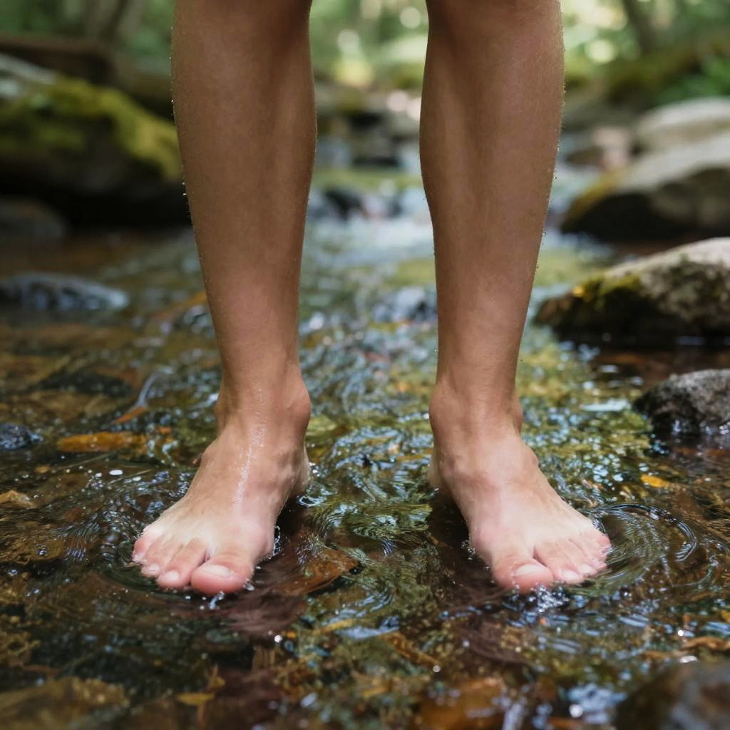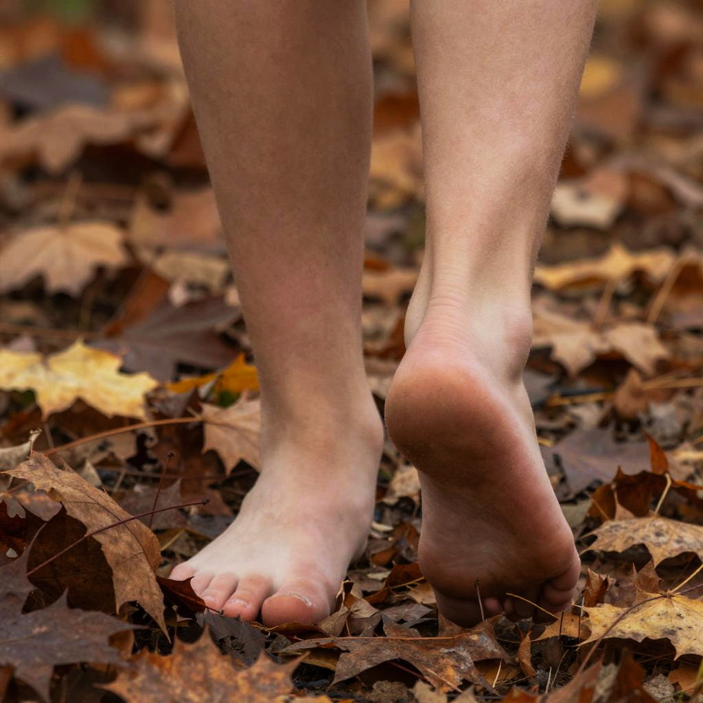 Close-up of teenage boy feet walking through autumn leaves, rich earthy tones, soft shadows, focus on natural skin tones and textures, vibrant and crisp detail