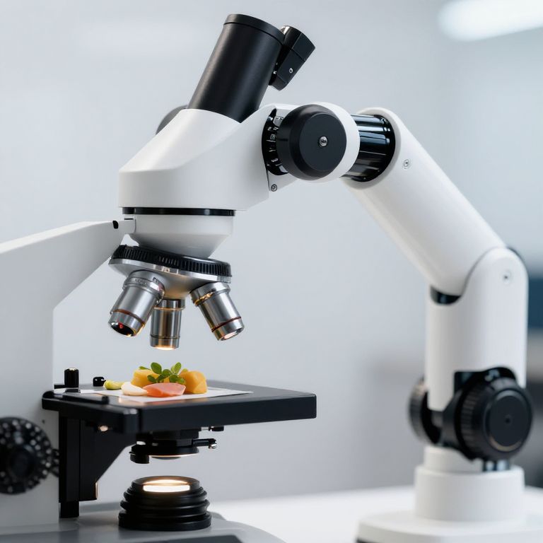 Prêt-À-Porter modern robotic arm holding food under a microscope detailed closeup not abstract realistic real life,