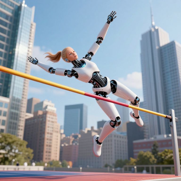 CGI image of a robotic woman with white and black body, jumping over a colorful high jump bar in an urban sky background.