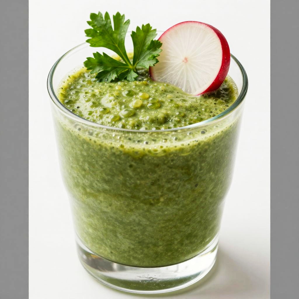 A close-up photo of a green smoothie in a clear glass with a wide, rounded base. The smoothie has a thick, creamy texture and a vibrant green color. A fresh, red-rimmed radish slice and a sprig of curly green parsley are garnishing the top. The background is plain white, making the green smoothie and garnishes pop. The photo has a gray border on the sides.