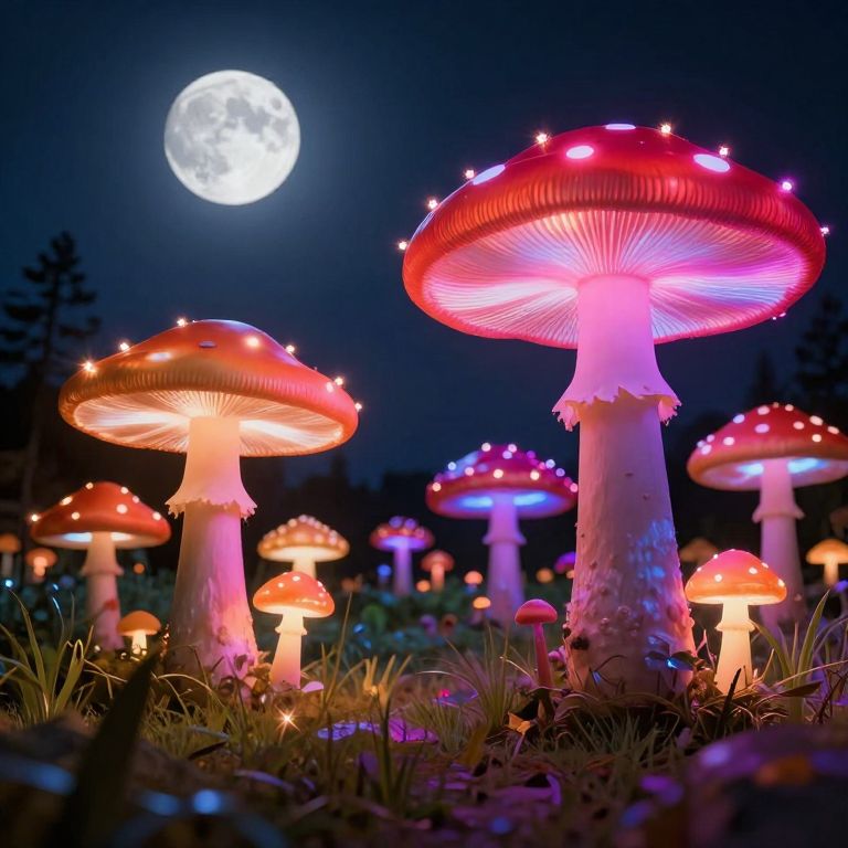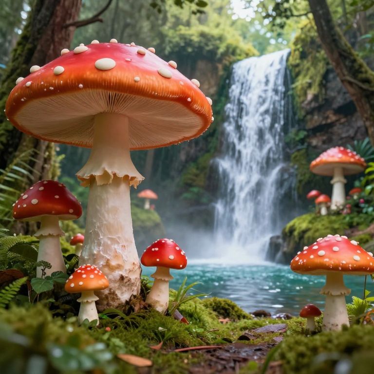 A vibrant digital artwork depicts a whimsical forest where oversized red mushrooms with white spots bloom alongside a serene waterfall, creating a fantastical scene with surreal, gravity-defying elements and a dreamlike, high-definition quality.