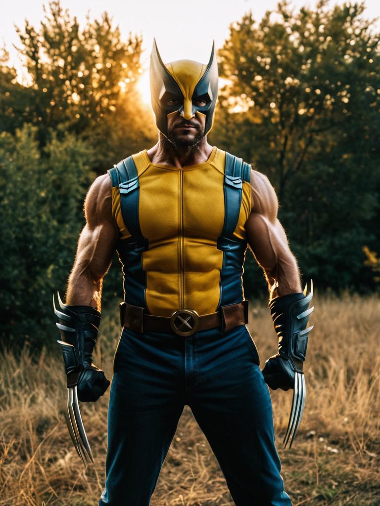 Man in Wolverine Costume, photorealistic outdoor portrait, golden hour